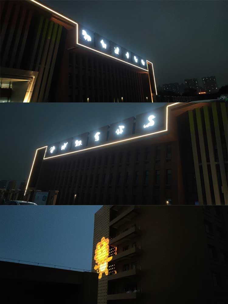 簡介—— 西安市兒童福利院亮化工程,主要是采用線條燈對樓體的頂部和側面輪廓進行勾勒,主樓安裝十二生肖發光造型,側墻采用圖案燈進行動畫投影,打出絢麗多彩的動畫卡通人物,與建筑的實用完整結合。